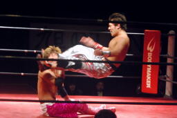 トウナイをリングに戻すとコーナーに振って小峠が串刺しビッグブーツ、ダブルのドロップキック(左写真)。
