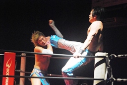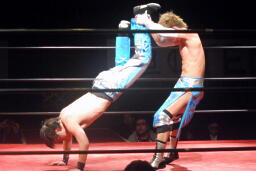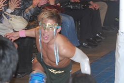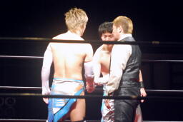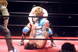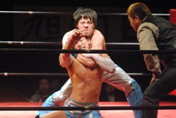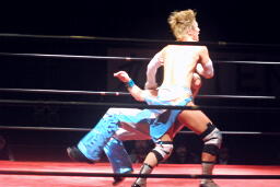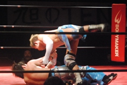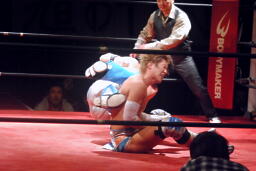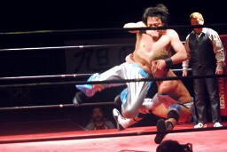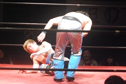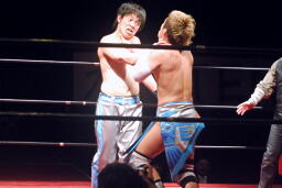 大石ミラクルエクスタシー狙うが旭はホイップで切り返す(右写真)。大石ソバット、旭はロープをつかんで突っ込んでくる大石を蹴り上げる。