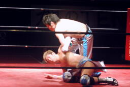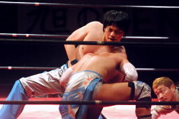 ロックアップ、旭がロープに押し込む、ブレーク。手繰り合いから旭バック取る、大石腕を取る(右写真)。旭カニばさみで倒しヘッドロック。