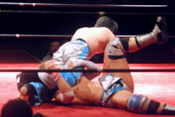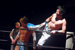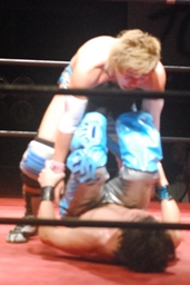 ロックアップ、大石バック取る、旭腕をひねる。腕を取られた大石、テイオーがよくやるエプロンに出て切り返す、というのをやるが旭もエプロンに出たため(左写真)成功せず。