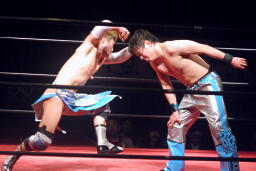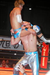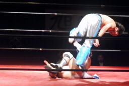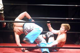 大石ヘッドロックからフライングメイヤー(右写真)、旭ヘッドシザーズ。