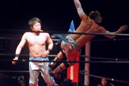 大石コーナーに振って突っ込む、旭ショルダースルーでエプロンに出す。大石ロープの間から足にキック、足目がけてスワンダイブミサイルキック(左写真)。