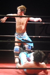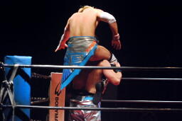 大石は場外への絶品狙うが旭ブロック。大石旭を鉄柱にぶつけ再度絶品の体勢、旭エプロンに上り大石をエプロンへのHIMAWARI-BOMB(右写真)。