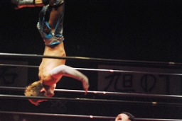 セカンドロープに飛び乗って絶品(左写真)、カウント2。旭場外エスケープ。
