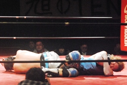 旭は2発目をかわしてバタフライロック(右写真)、大石立ち上がるが旭再度腰を落として絞る、大石ロープ。15分経過。