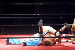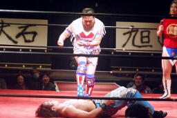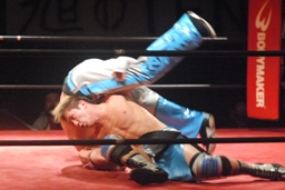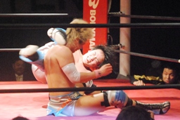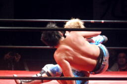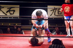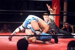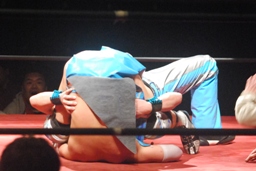 大石切り返す、旭切り返してエビ固め(右写真)、カウント2。