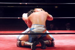 両者ヒザ立ちでロックアップ(右写真)、