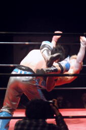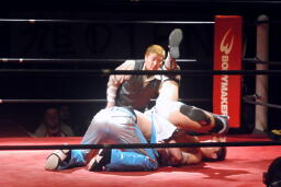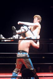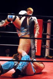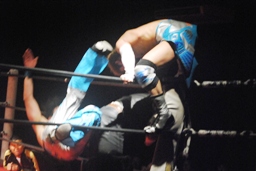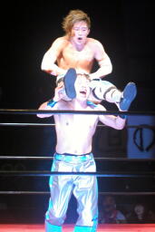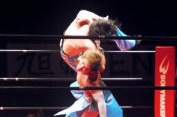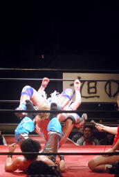 直伝トルネードクラッチ(右写真)、カウント2。