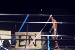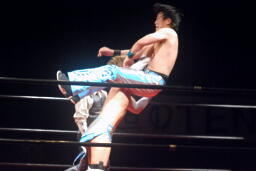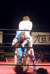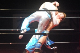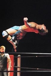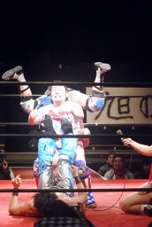 大石コーナーに上ってシューティングスタープレス(右写真)、