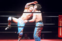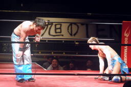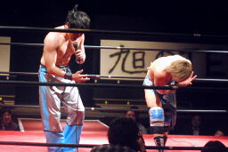 旭阿吽(左写真)、大石カウント1で返す。ダブルノックダウン。
