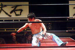 大石再度コーナーに上る、旭は下からジャンピングハイキック(右写真)。