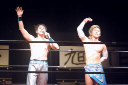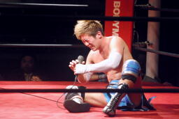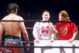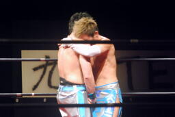 大石「ほんとですねー。・・・3年前、シングルマッチやった時にも言ったけど、もう一回言っていいですか?今はDDTとKAIENTAI-DOJO、2つに分かれてしまったけど、大石真翔というレスラーの隣にずっといてください。」