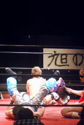 旭は十字架固めに切り返す(左写真)、カウント2。25分経過。