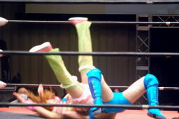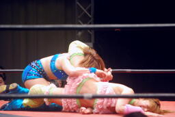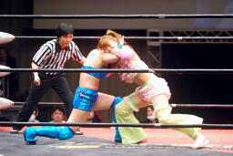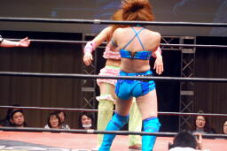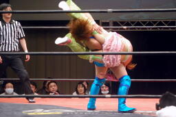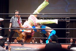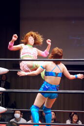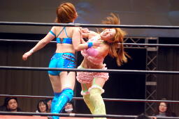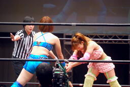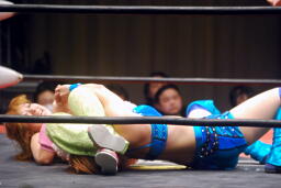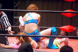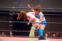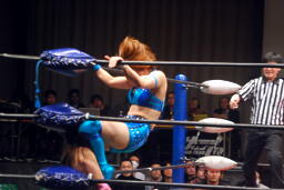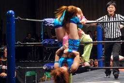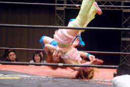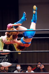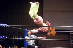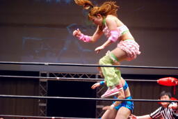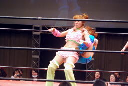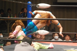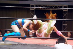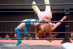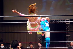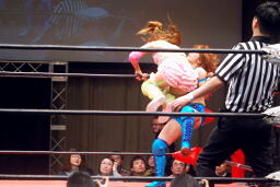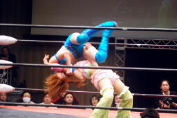栗原ストンピング、ロープに振ってパンチ、チェリー側転でかわしてフライングネックブリーカードロップ(左写真)。チェリーダブルリストアームサルト、カウント2。