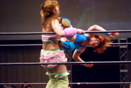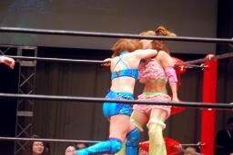 チェリーロープに飛ぶ、栗原追走式ドロップキック(右写真)。栗原ロープに飛ぶ、チェリー追走式ヒップアタック。