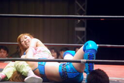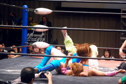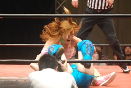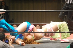 チェリーファンタジーイリュージョン狙うが(右写真)体勢が崩れ失敗、強引に片エビに固めるがカウントは2。