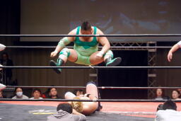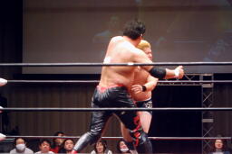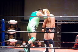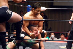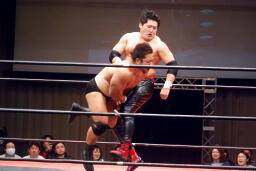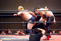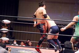 関本ガットショット、チンロック(左写真)、入江ロープ。関本ストンピング、ボディスラム、橋本にタッチ。5分経過。
