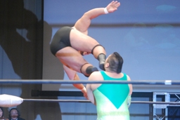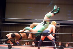 石川関本にボディスラム、入ってきた橋本にもボディスラム。関本が背後からパンチ、ダブルでロープに振るが石川は2人まとめてクロスボディで押しつぶす(右写真)。