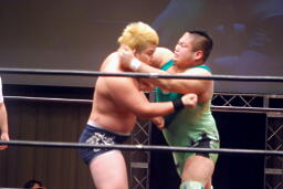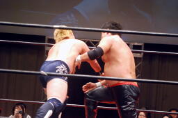 先発は石川と橋本。ロックアップ、石川ロープに詰める、ブレーク。再度ロックアップ、今度は橋本がロープに押し込む、エルボー打ち合い(右写真)。両軍タッチ。