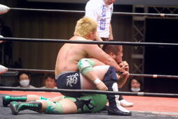 橋本首投げからサッカーボールキック(左写真)。サッカーやってたらしいからリアルサッカーボールキックだ。橋本が足で踏みつけてカバーすると京平「ちゃとてで押さえんか!」とカウント取らず。若手が序盤からこれはないよな。対抗戦麻痺かな、これも。