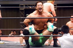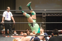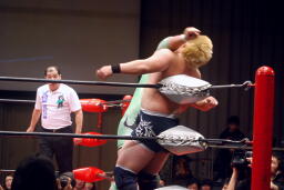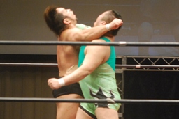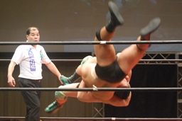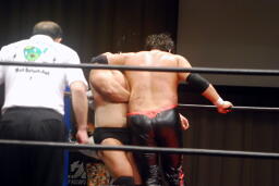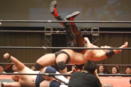 関本コーナーに振って突っ込む、入江カウンターのバックエルボー、入江ロープに飛ぶ、関本ガットショット、ブレーンバスターに行くが入江切り返す(左写真)、石川にタッチ。