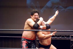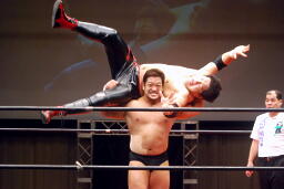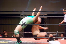 関本ラリアット、石川かんぬきに捕らえヘッドバットからかんぬきスープレックス(右写真)。両軍タッチ。