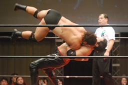 関本ロープに飛ぶ、石川カウンターのニーリフト(右写真)。石川パワーボム狙う、関本リバース。