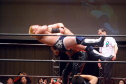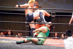 橋本キャメルクラッチ(右写真)、リリースしてエルボードロップ、カウント2。関本にタッチ。