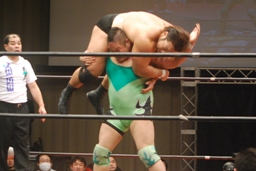 コーナーに振って串刺しラリアットからダブルアームスープレックス(右写真)、カウント2。