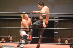 コーナーに振って突っ込む、関本カウンターのキックからミサイルキック(右写真)。首投げ、橋本にタッチ。