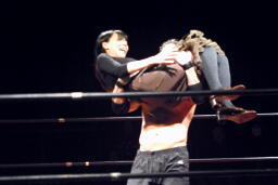 キスを求めるエディに「Close your eyes」と目をつぶらせ、木曽レフェリーを突き出してキスさせる美央(右写真)。策士!