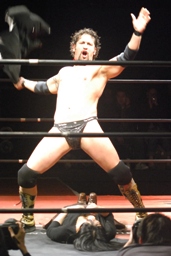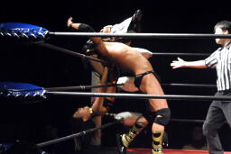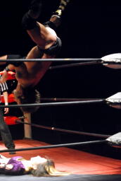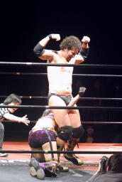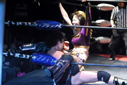 美央コーナーに上ってミサイルキック(右写真)、カウント2。5分経過。