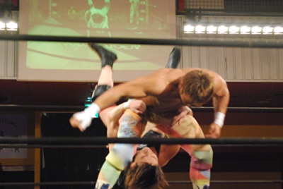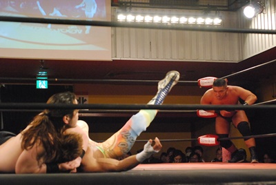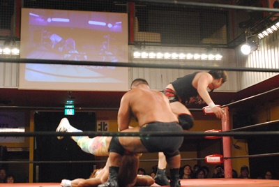 高木がサイドバスターの体勢に捕え、ビッグがコーナーからダブルアックスハンドル(右写真)、高木カバー、カウント2。
