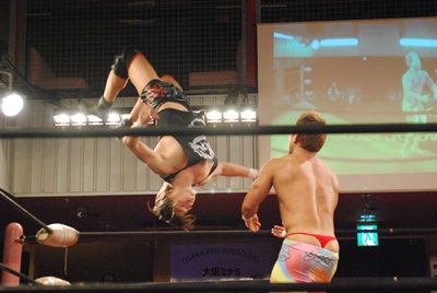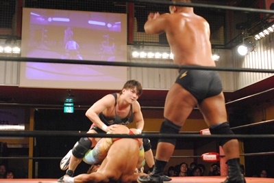 ビッグラリアット、円華かわしてネックブリーカードロップ(左写真)、大家にタッチ。