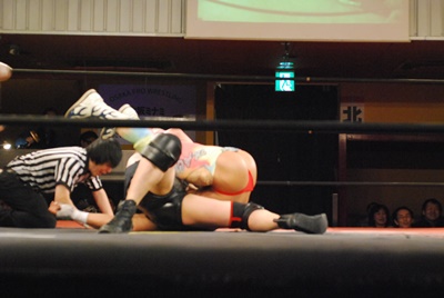 パンチの打ち合いから円華が再度回転エビ固め、ビッグがブロックすると半ケツ状態に(右写真)。円華丸め込む、カウント2。