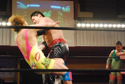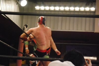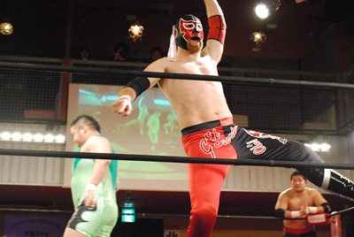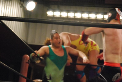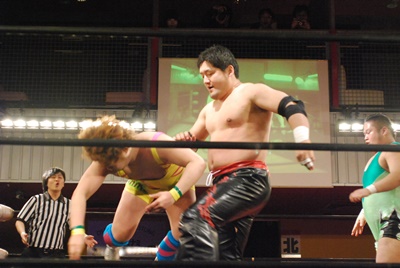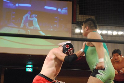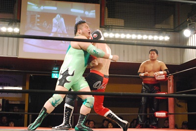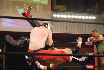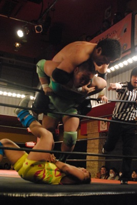 福田パンチ(右写真)、入江エルボー、福田ダウン。入江は石川にタッチ。