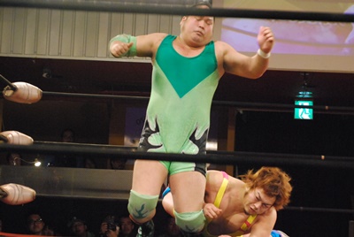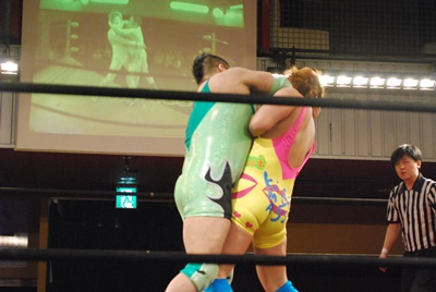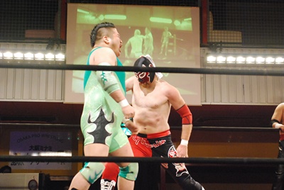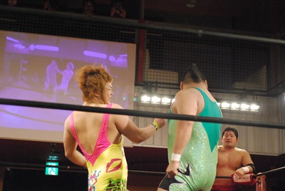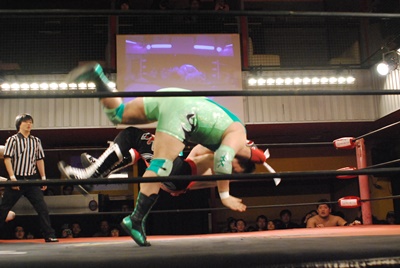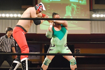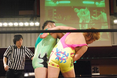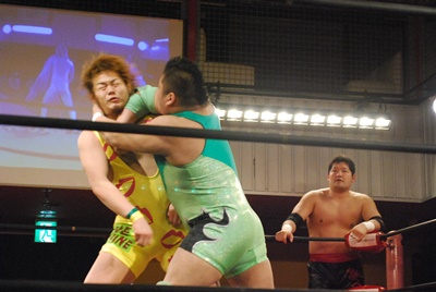 3度目福田ヘッドロック、ロープに振ってショルダーブロック打ち合いは石川の勝ち(右写真)。石川ボディスラム、入江にタッチ。