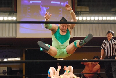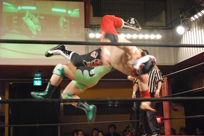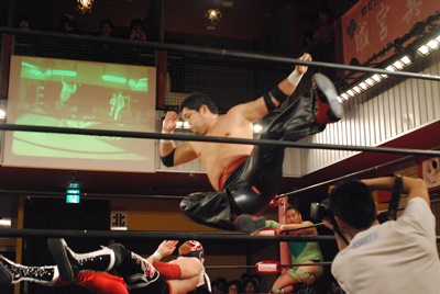 入江ロープに飛ぶ、福田キャッチしてプリックバスター(右写真)、カウント2。