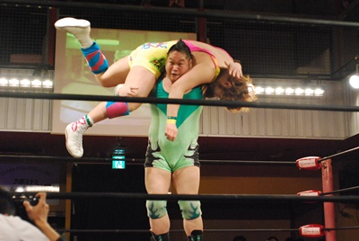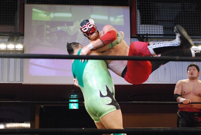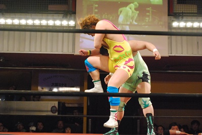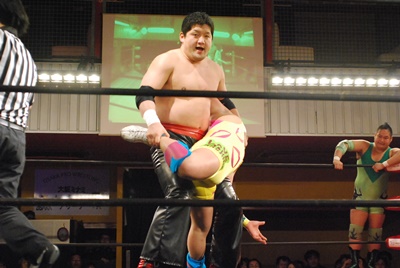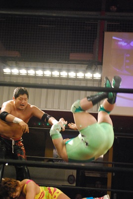 ジェネリコチョップ連打からロープに飛ぶ、入江キャッチしてブラックホールスラム(右写真)、石川にタッチ。