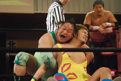 入江エルボー、ボディスラムから福田の腹に乗る、そこに石川も上から乗る(右写真)。5分経過。