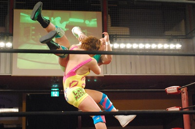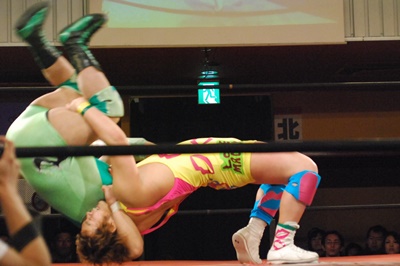 福田ココ☆ナツクラッシュ(左写真)、ロープに飛ぶ、入江は追走式ラリアット。