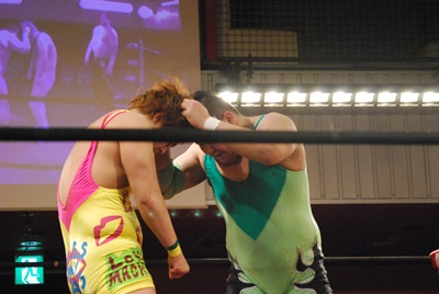 ジェネリコ立ち上がってヘッドロック、入江ロープに振る、ショルダーブロックの打ち合い(右写真)。