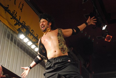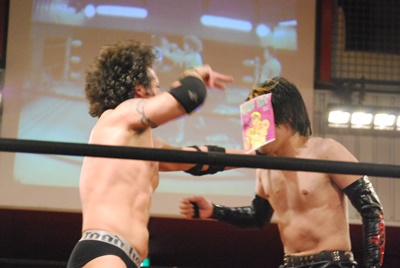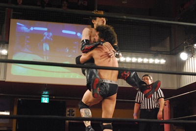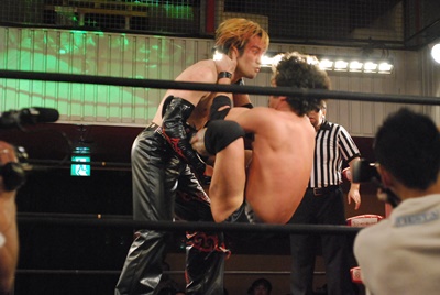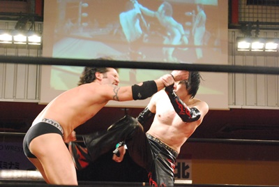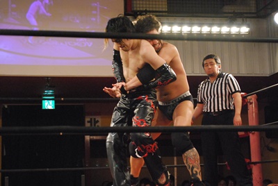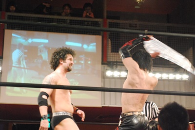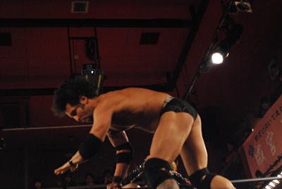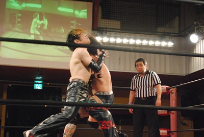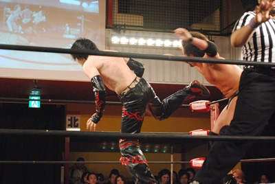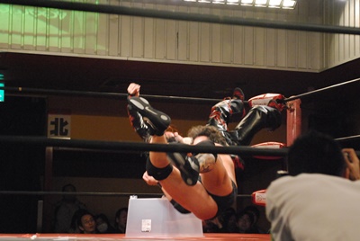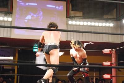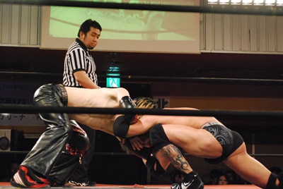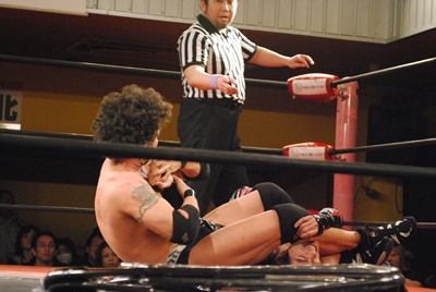 試合開始。ロックアップ、エディがまずバック取る(右写真)、イサミ腕を取って切り返す、エディは足をすくって片逆エビに、イサミはエビ固めに、カウント2。
