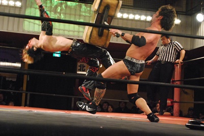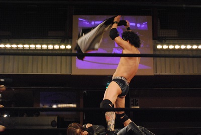 ロープワークからイサミがリープフロッグ、エディキャッチしてマンハッタンドロップ(左写真)。