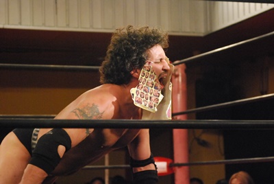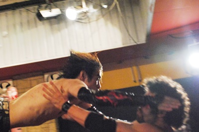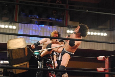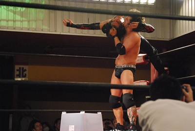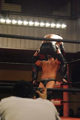 イサミコーナーに振って突っ込む、エディはバックエルボー、額に噛みつき。プラケースへのDDT狙うがイサミは切り返してプラケースにリバースDDT(左写真)。