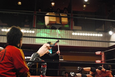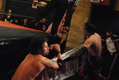 イサミはまたも背中からラダーに激突(左写真)。カバー、カウント2。