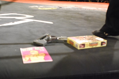 エディがガベッジバケツの中身をリングに空ける。ステープラー、ビデオテープなどに交じってなぜか福田洋FC会報「FUKUDA HOLIC vol.1」も(左写真)。