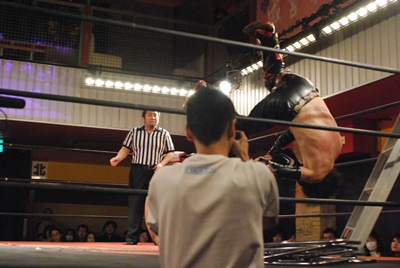 場外でラダー使って攻める(左写真)。