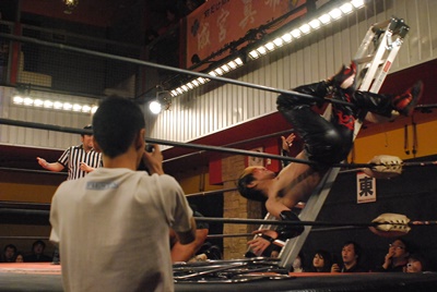 コーナーにラダー立て掛け、イサミを振る、イサミ寸前でストップするがエディは追撃のドロップキック、イサミはラダーに背中ぶつける(右写真)