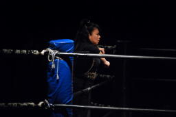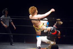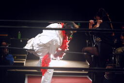 凛音コーナーに振って突っ込む、福田ショルダースルーで凛音をエプロンに出すが凛音はエプロンからハイキック、コーナーに上って真空美日月斬り(右写真)、カウント2。